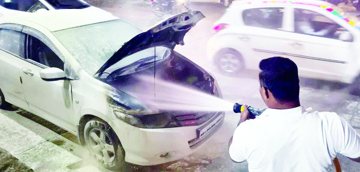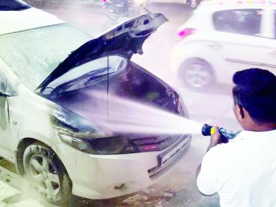 A car caught fire following a short circuit on its bonnet in the Seven Hills area on Saturday evening. The vehicle (MH-20-BN-4907), driven by Nitin Bhavare, was travelling from Gajanan Maharaj Mandir towards Seven Hills when smoke began emerging near the Seven Hills signal.