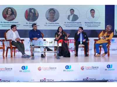 Dr. Revathi Srinivasan (Singhania Group of Schools), Dr. Skand Bali (Hyderabad Public School), Dr. Sreekanth Koganti (Independent Schools Management Association), Dr. Pratima Sinha (DSR Education Society), and Manikandan Krishnan (Kreedo), under the moderation of C.P. Viswanath (Karadi Path Education Company), examined how to engage Gen Alpha learners growing up in a screen-first environment.