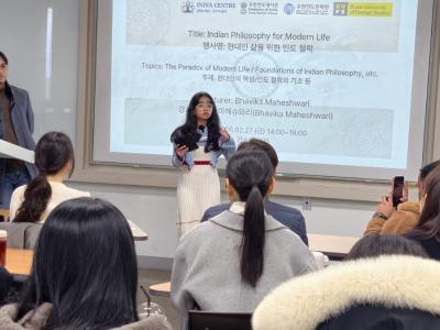 During her recent international tour, Bhavika delivered several key lectures in collaboration with the Indian Embassy, Swami Vivekananda Cultural Centre, and other institutions. At the Busan University of Foreign Studies in South Korea, she addressed the topic “Indian Philosophy for Modern Life.” Her lecture was translated into the Korean by Professor Mr. Sarjan Kumar. Students and scholars present at the event appreciated her insights. The Indian Council for Cultural Relations (ICCR) also highlighted her achievement on its Official online platform, and she was honored by the Chairman Mr. Soon Seol Lee during the program.