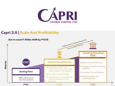 Capri Global is a diversified Non-Banking Financial Company (NBFC) with a presence across diverse and high growth segments like MSME, Affordable Housing, Construction Finance segments, and Car Loan distribution. Company also forayed into Gold Loans in Aug 22. Company is promoted by first generation entrepreneur, Mr. Rajesh Sharma and listed on BSE and NSE. With 917 branches in 14 states & UTs across North and West India and over 10,150 employees, company has reported AUM of Rs. 124 billion in Q2FY24. Promoter Group holds 69.89% stake in the company as on 31st Dec 2023. Going forward company is targeting AUM of Rs. 300 billion and earning target of mid-teen ROE over medium term with a strong focus on the business segments including Gold Loan, Affordable Housing and MSME loans.