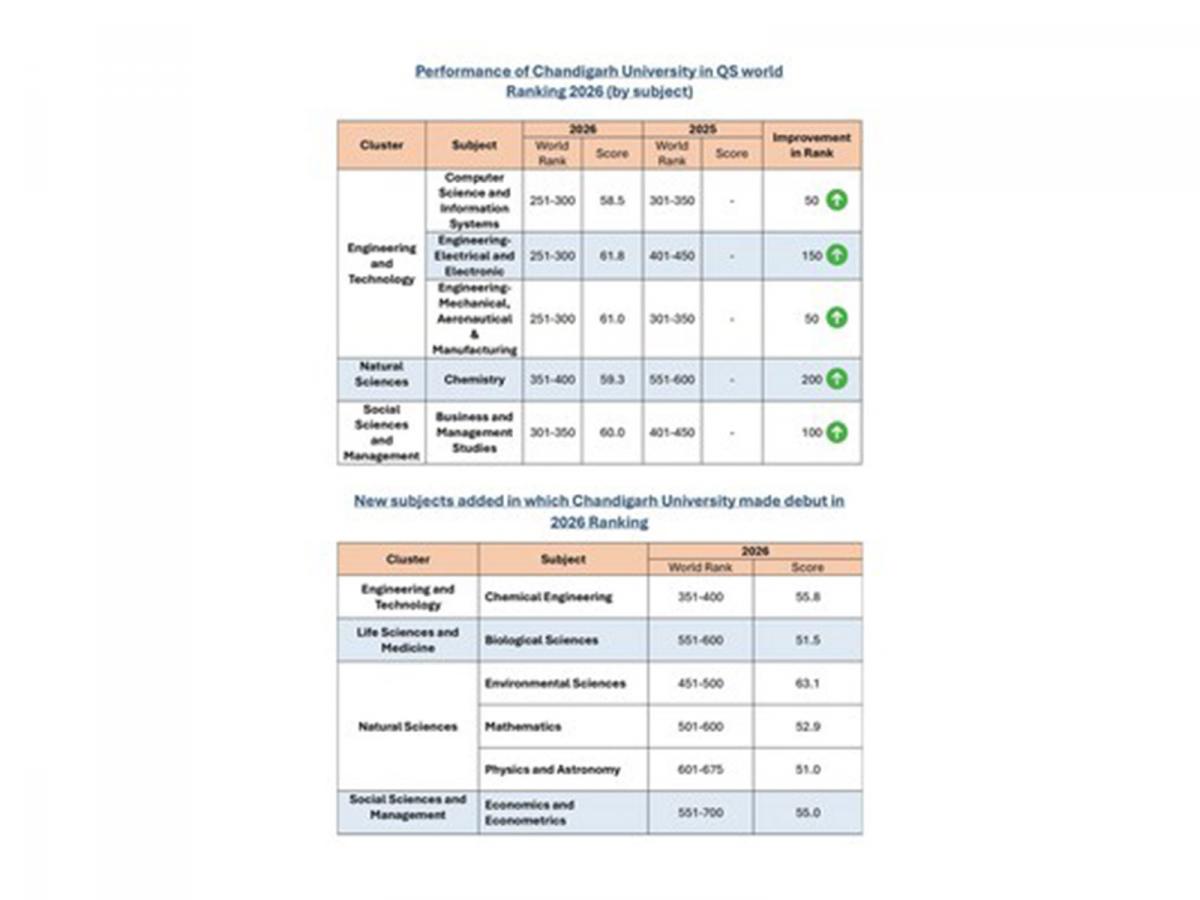 Making a stellar debut, Chandigarh University has entered the league of world's top universities in the six new subjects in the QS World University Rankings by Subjects-2026.