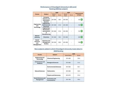 Additionally, Chandigarh University is now ranked among world's top 400 universities in 6 subjects in 2026, which is up from 2 subjects in 2025 rankings. These six subjects include Business & Management Studies, Chemistry, Chemical Engineering, Computer Science and Information Systems, Electronics and Electronics Engineering and Mechanical, Aeronautical & Manufacturing Engineering.