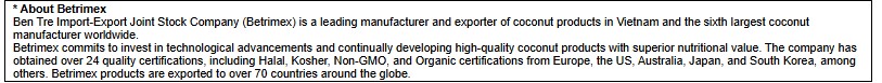PRNewswire Ben Tre [Vietnam], December 31: Ben Tre Import-Export Joint Stock Company (Betrimex) in collaboration with Vietnam Coconut Association ...