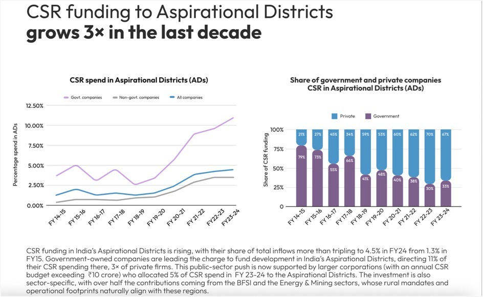 CSR allocations to Aspirational Districts have increased steadily over the past decade. Their share of total CSR inflows has risen more than threefold, from 1.3 per cent in FY15 to 4.5 per cent in FY24. Government-owned companies have played a leading role in this shift, directing about 11 per cent of their CSR spending to these districts, nearly three times the share allocated by private firms. Larger corporations with annual CSR budgets above ₹10 crore have also begun expanding investments in these regions, accounting for around 5 per cent of their CSR deployment in FY24. Sectorally, over half of the funding into Aspirational Districts has come from BFSI and energy and mining companies whose operational footprints are closely tied to rural geographies.