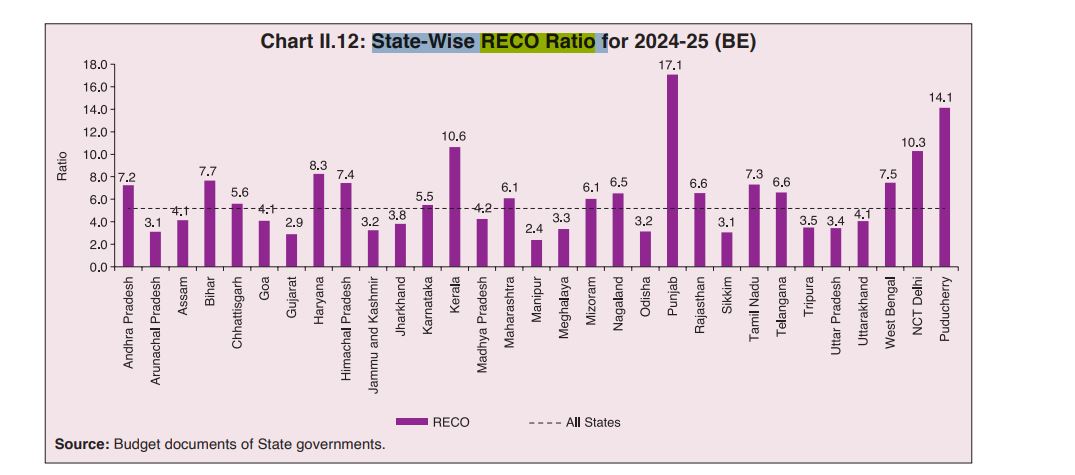 A high RECO Ratio of more than 10 indicates that a state is spending significantly more on revenue expenses compared to capital outlay. It suggests a limited focus on infrastructure and developmental spending, potentially constraining long-term growth. High ratios can also point to fiscal inefficiencies and excessive focus on non-asset-creating expenditures.