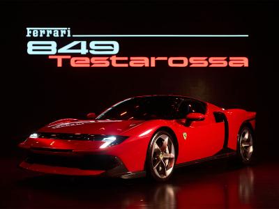 Positioned as a plug-in hybrid super sports berlinetta, the 849 Testarossa features a reengineered mid-rear twin-turbo V8 engine paired with three electric motors. This powertrain delivers a combined output of 1,050 CV, allowing the vehicle to reach 100 km/h in less than 2.3 seconds and 200 km/h in 6.35 seconds.