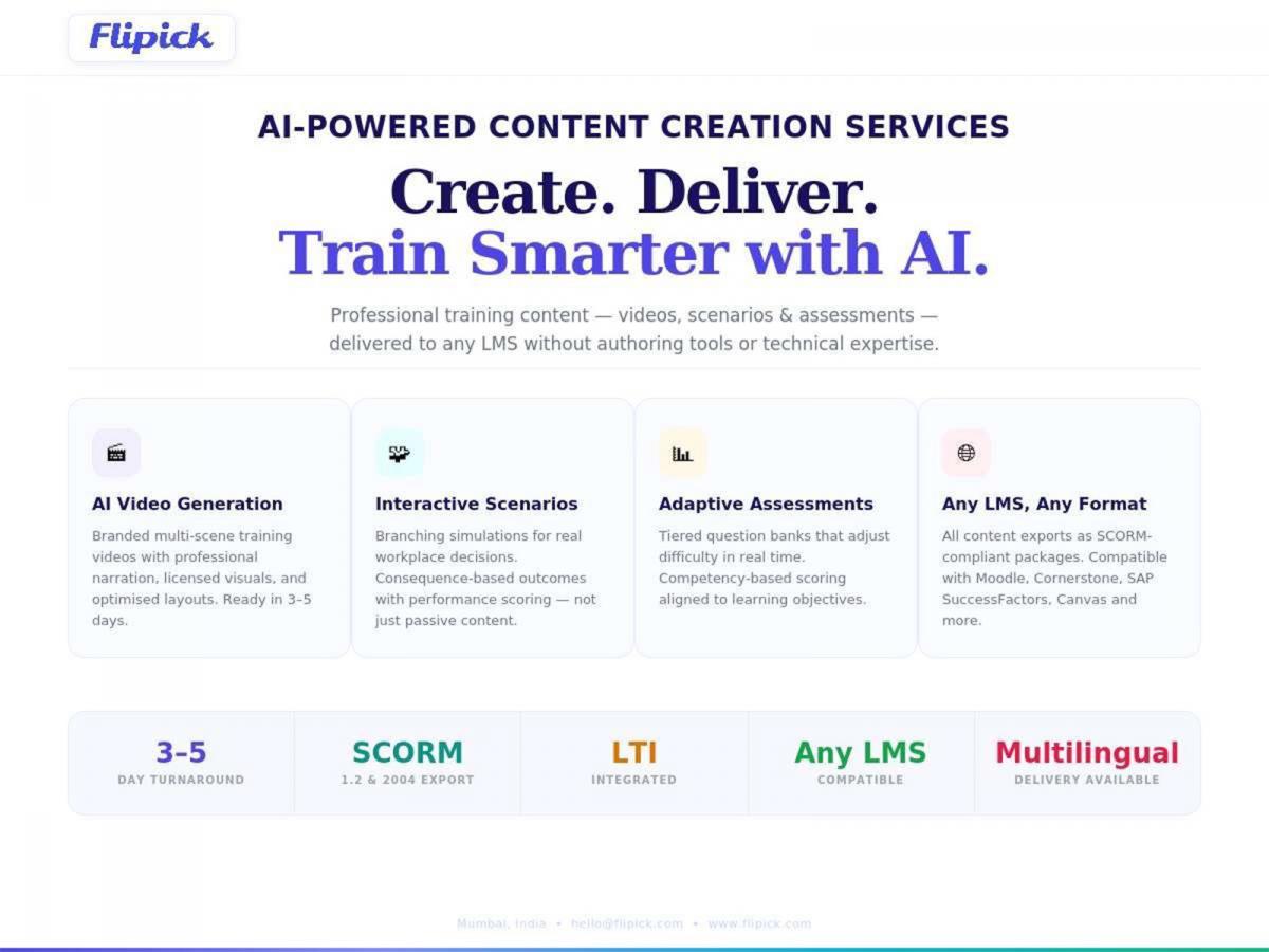 The services address a major challenge for learning teams: organizations often deploy learning management systems but struggle to produce engaging, high-quality training content quickly. Flipick's managed content services solve this gap by producing ready-to-deploy learning materials compatible with industry-standard LMS platforms.