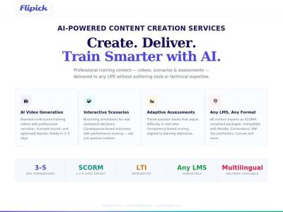 Flipick provides AI-powered training content creation services and enterprise learning technology, enabling organizations to build scalable learning ecosystems with professional videos, interactive scenarios, and adaptive assessments compatible with any LMS.