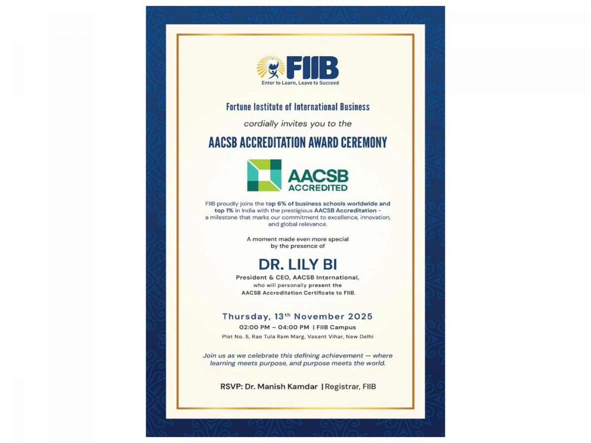 New Delhi [India], November 6: The Fortune Institute of International Business (FIIB) proudly announces that it has earned accreditation from AACSB International (Association to Advance Collegiate Schools of Business), the world's longest-serving and most recognized accrediting body for business schools.
