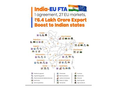New Delhi [India], January 27 : States across India are set to benefit from the landmark India-European Union Free Trade Agreement (FTA), with exports estimated at Rs 6.4 lakh crore expected to gain access to 27 EU markets under a single trade framework, Commerce Minister Piyush Goyal said in a post on X.