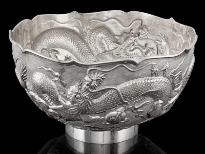 Another notable inclusion in the auction is lot no. 108, A Silver Dragon Motif Bowl with a commanding dragon motif in high relief. Finely chased against swirling waves and clouds, the design continues within the bowl in repousse, while the fluid rim mirrors the movement of the decoration, making it an impressive and symbolic ornamental piece.