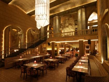 Lighting plays a critical role in balancing the grandeur of the space. Warm amber lighting is discreetly placed behind arches, sculptures, and textured surfaces, allowing stone finishes and carved details to glow softly. During the day, natural light filters through semi-open areas and balconies, creating an airy and welcoming atmosphere. As evening sets in, the lighting transitions seamlessly, lending the space a more intimate yet energetic character.
