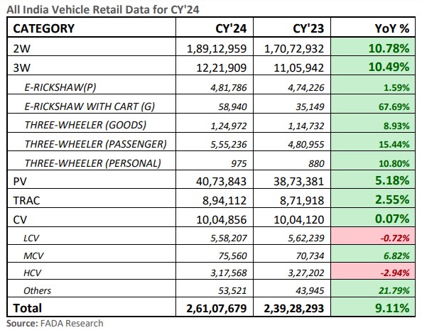 In December, the last month of 2024, overall retail automobile sales however declined by 12.4 per cent, with two-wheelers (-17.6 per cent), three-wheelers (-4.5 per cent), PV (-1.9 per cent) and CV (-5.2 per cent) facing de-growth. Only tractor showed a 25.7 per cent yearly jump in sales in December.