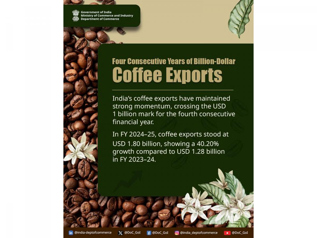New Delhi [India], November 2 : India's coffee exports have continued their strong upward trajectory, maintaining their billion-dollar streak for the fourth consecutive financial year, according to the Department of Commerce under the Ministry of Commerce and Industry.