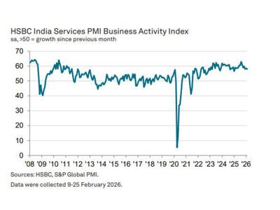 Registering 58.1 in February, the seasonally adjusted HSBC India Services PMI Business Activity Index - based on a single question asking how the level of business activity compares with the situation the month before - was broadly similar to January's reading of 58.5 and therefore indicated another sharp expansion in output.