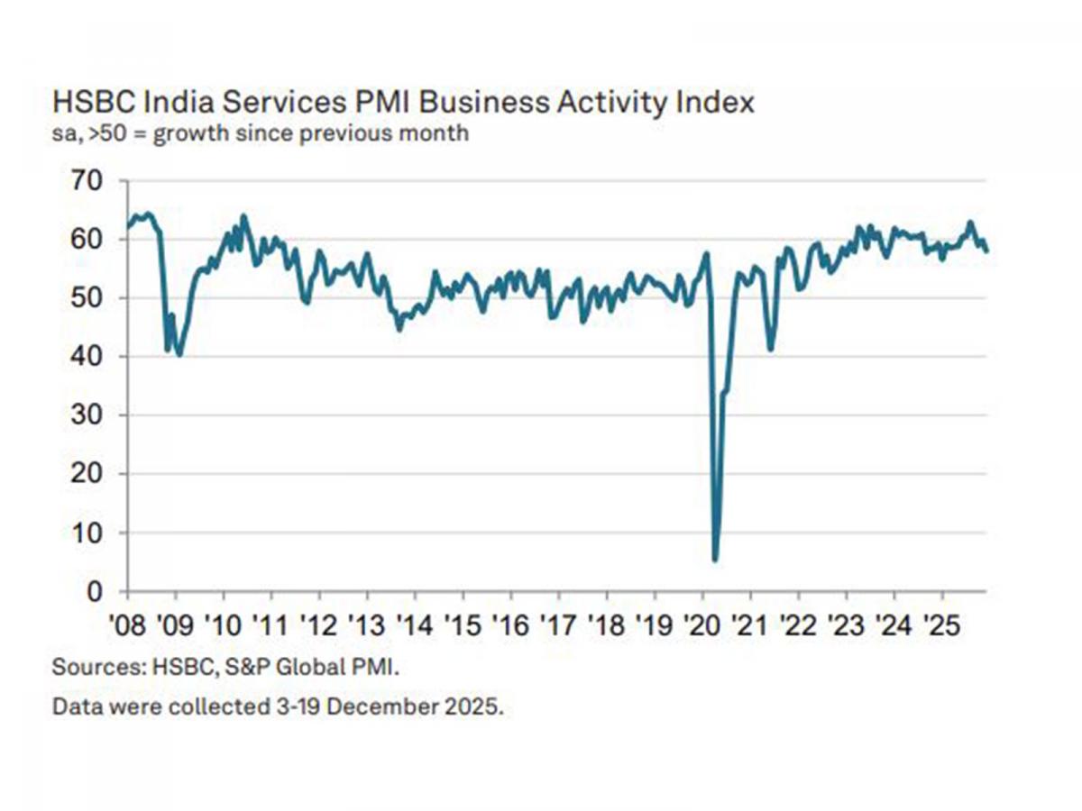 The seasonally adjusted HSBC India Services PMI Business Activity Index - based on a single question asking how the level of business activity compares with the situation the month before - fell from 59.8 in November to 58.0 in December, indicating the slowest rate of expansion since January.