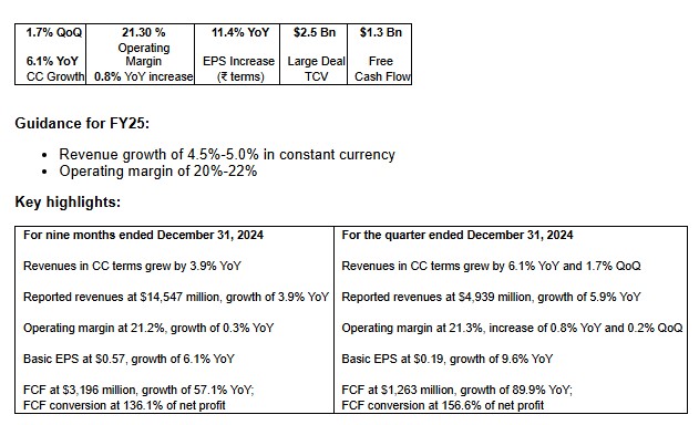 "We had another quarter of strong performance with revenue growth across segments and operating margin expansion, leading to 11.4% EPS growth year on year in rupee terms. Our structured approach to operating margin expansion yielded more results in Q3, particularly due to benefits from improving realization and scale benefits," said Jayesh Sanghrajka, CFO. "Our sharp focus on cash flow is reflected in Free cash conversion to net profits of 157% in Q3 with free cash generation for 9 months of FY25 surpassing that of entire FY24," he added.