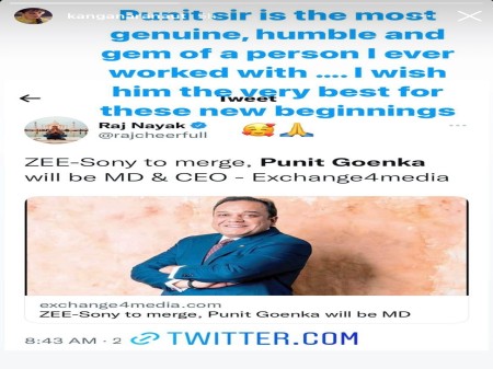 Now, reacting to the merger, actress Kangana Ranaut took to her Instagram stories and praised Puneet Goenka for being a “gem of a person”. She also congratulated him and also wished him the best for the future. Taking to her Instagram story, the Queen actress wrote, Punit sir is the most genuine, humble and gem of a person I ever worked with . I wish him the very best for these new beginnings,” she wrote. The combined entity of ZEEL and SPNI will operate a network of 75 channels, which will account for around 26% viewership share. The shareholders of Sony Pictures will hold a majority stake in the merged entity. The parent company of SPNI is also infusing USD 1.57 billion into the merged group. Zee Entertainment will hold 47.07 per cent stake, while Sony India will hold a majority stake of 52.93 per cent in the merged company, according to the statement.