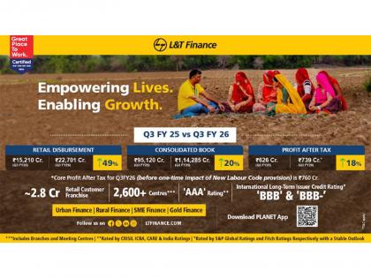 Mumbai (Maharashtra) [India], January 20: L&T Finance Ltd., formerly known as L&T Finance Holdings Ltd. (LTF), one of the leading Non-Banking Financial Companies (NBFCs) in India, has recorded its highest ever core Profit After Tax (PAT) of Rs. 760 Crore (before one-time impact of New Labour Code provision), up 21% YoY (Year-on-Year) in the third quarter ended December 31, 2025 (Q3FY26). PAT after one-time impact of New Labour Code stands at Rs. 739 Crore, up 18% in Q3FY26. During the quarter, the retail book size reached Rs. 1,11,990 Crore, up 21% YoY. The consolidated loan book grew by 20% YoY to Rs. 1,14,285 Crore. The Company has recorded the highest ever quarterly retail disbursement of Rs. 22,701 Crore for the third quarter ended December 31, 2025, up 49% YoY. The Company also recorded all-time high disbursements in Two-wheeler Finance at Rs. 3,217 Crore and Farmer Finance at Rs. 2,783 Crore growing 33% YoY and 12% YoY, respectively. Retailisation stood at 98% of overall book as on December 31, 2025.
