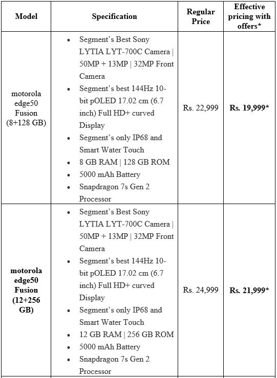 Starting with the premium category of edge series, the motorola edge50 Fusion, can be purchased at an effective starting price of just Rs. 19,999* for the 8GB+128GB variant and Rs. 21,999* for the 12GB+256GB variant. The motorola edge50 Fusion is equipped with segment's best Sony LYTIA LYT-700C camera, a 50MP camera with all-pixel instant focus technology, Optical Image Stabilization (OIS), and 4K video recording. The devices also flaunts the segment's best 144Hz 10-bit pOLED curved display with 1600 nits of peak brightness and Corning® Gorilla® Glass 5 Protection. With regards to the design, the smartphone is the segment's only IP68 rated device and also features Smart Water Touch for seamless running display. All this makes the motorola edge50 Fusion the best smartphone under INR 20K featuring several segment-best and exclusive features.