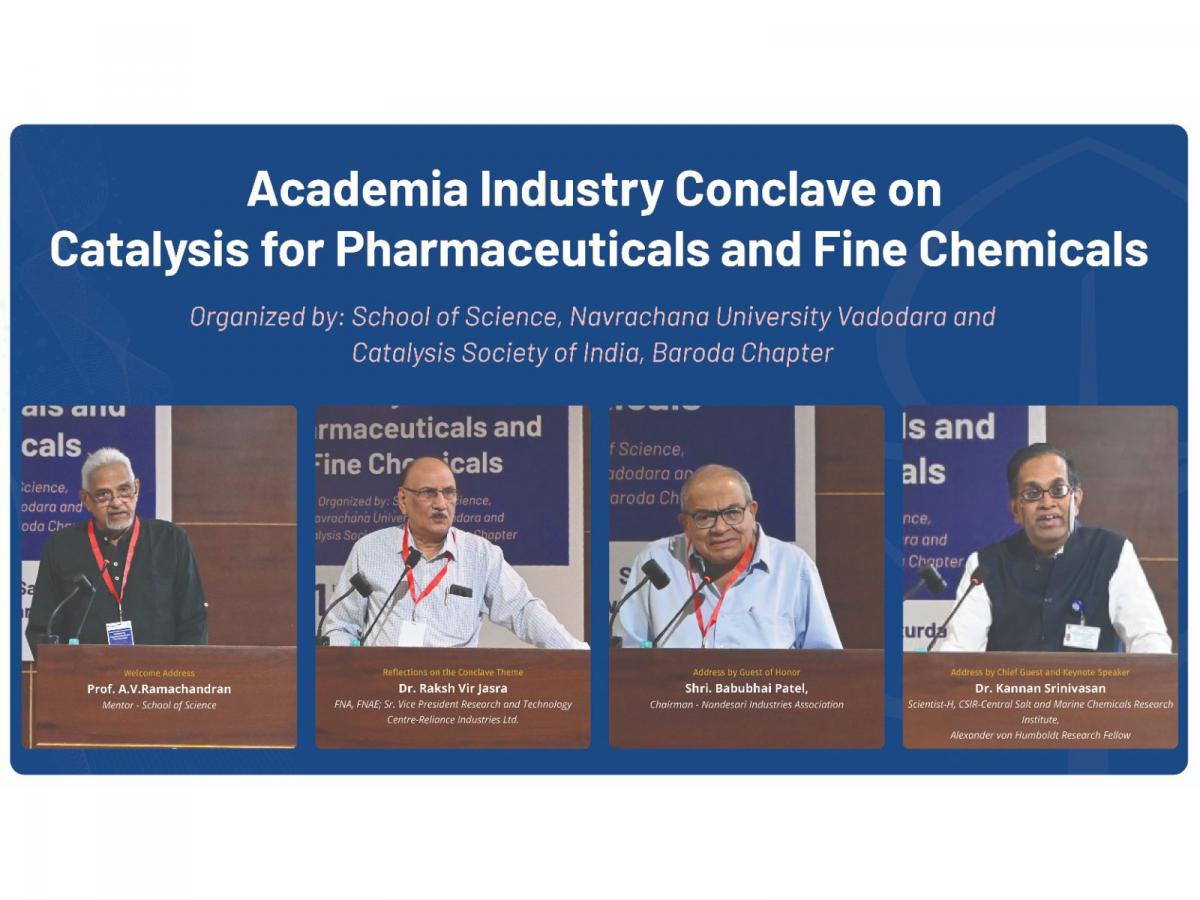 The School of Science, Navrachana University, in collaboration with the Catalysis Society of India-Baroda Chapter, organized the Academia-Industry Conclave on Catalysis for Pharmaceuticals and Fine Chemicals (AICC-PFC) on April 11, 2026. The conclave focused on how catalytic science can enable greener processes, improve efficiency, and support India's growing role in pharmaceuticals and fine chemicals.