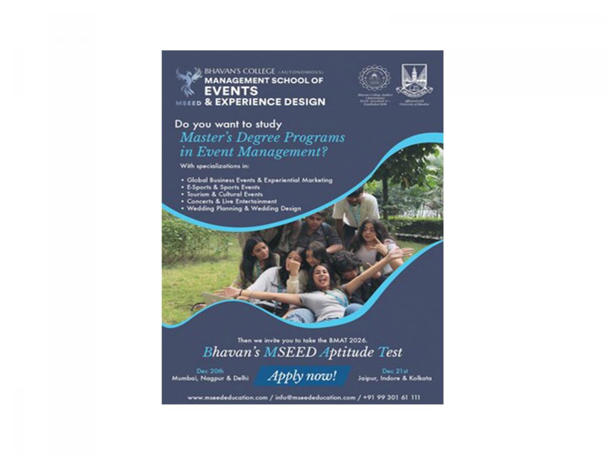 Mumbai (Maharashtra) [India], December 1: Bhavan's College Management School of Events & Experiential Design (MSEED) offering Bachelor's and Master's degrees in Event Management, has announced its Scholarship Exam - BMAT (Bhavan's MSEED Aptitude Test) for the academic year 2026-27.