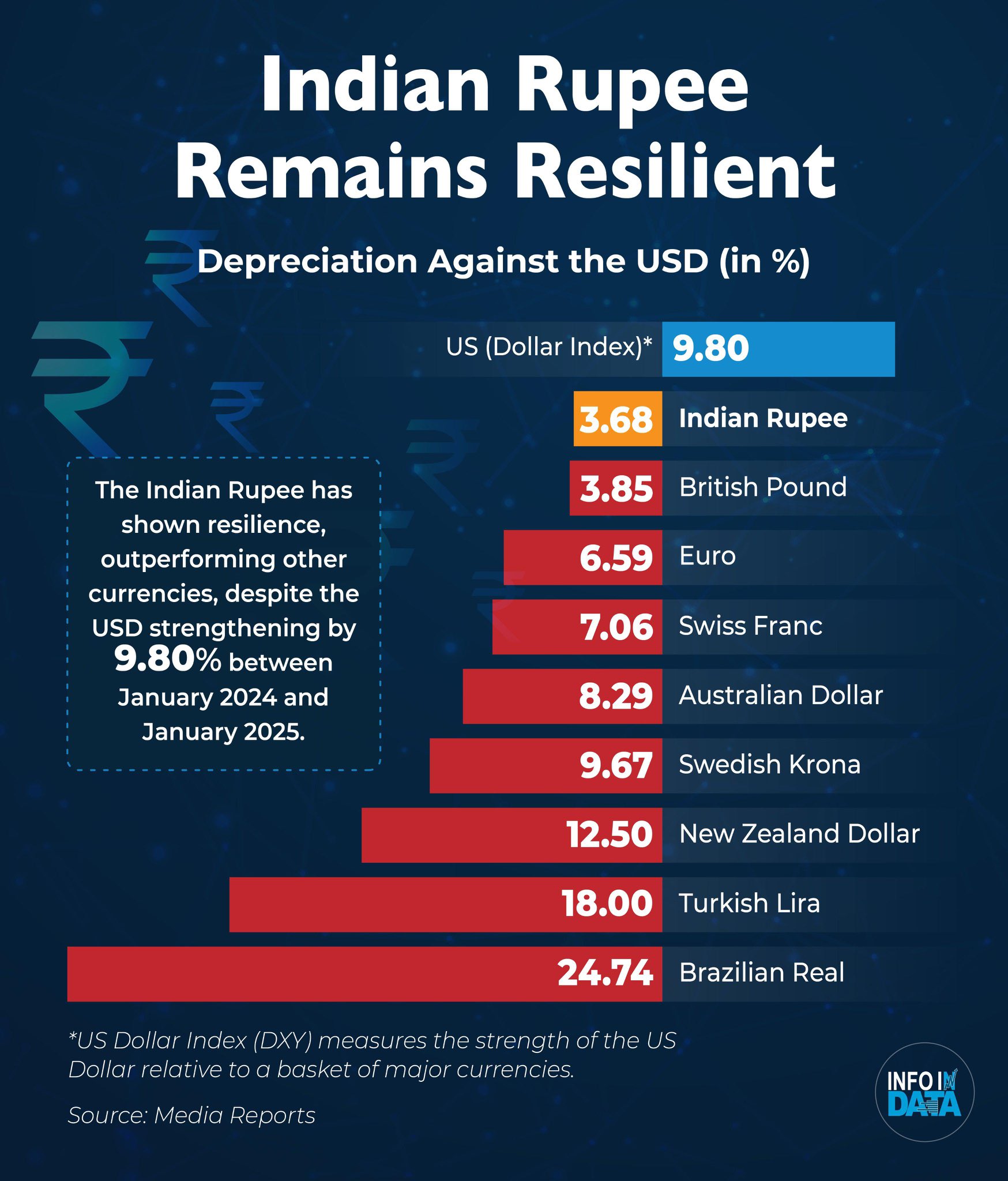 "India's improved external position, reduced current account deficit, and strong foreign exchange reserves have made the rupee one of the most stable currencies globally. Over the past year, even as the US Dollar Index surged by 9.8 per cent, the rupee depreciated by a modest 3.68 per cent, outperforming major currencies like the Japanese Yen and Korean Won, which fell by 9 per cent-12 per cent during the same period," Malviya stated.