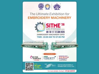 The SITME 2026 – Embroidery Machinery Expo will witness participation from over 60 textile machinery manufacturers from Surat, Ahmedabad, Pune, and New Delhi, collectively showcasing more than 100 advanced embroidery machines. The exhibition is expected to attract over 25,000 buyers and visitors from across the country through online registrations, including more than 1,000 buyers from outside Surat.