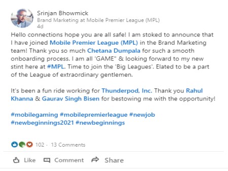 Srinjan played a key role in creating a brand and marketing plan for Manushi Chhillar who brought the Miss World crown back to India after 17 years. Srinjan has worked as a social media evangelist, copywriter, content manager, brand strategist, video content producer, and community manager. Srinjan made this announcement via a LinkedIn Post. He said, “I am all ‘GAME and looking forward to my new stint here at #MPL. Time to join the ‘Big Leagues’. Elated to be a part of the League of extraordinary gentlemen.”
