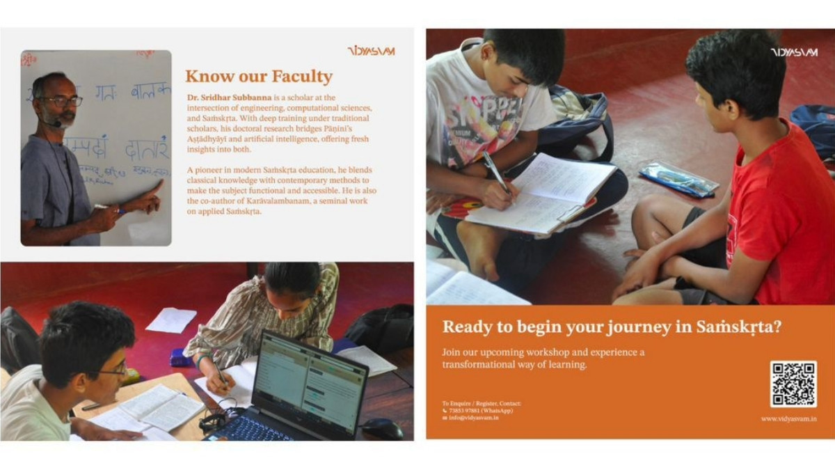 Rooted in the classical framework of Pāṇini's Aṣṭādhyāyī, the workshop offers an immersive learning experience that blends traditional grammar with contemporary pedagogy. Unlike conventional memorization-heavy approaches, Vidyasvam's methodology emphasizes conceptual clarity, analytical thinking, and gradual progression from fundamentals to text interpretation.