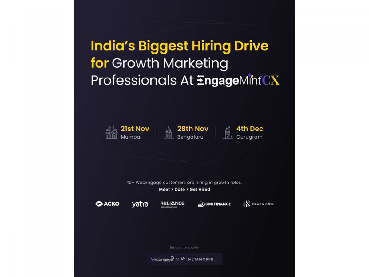 Mumbai (Maharashtra) [India], November 19: WebEngage, a leading SaaS platform offering Customer Data and Engagement solutions has announced 'India's biggest hiring drive for growth marketing professionals' in partnership with MetaMorph. The initiative aims to connect the country's top consumer brands with pre-vetted talent across mobile marketing, CLM operations, and product analytics, professionals who have prior experience using WebEngage or similar software.