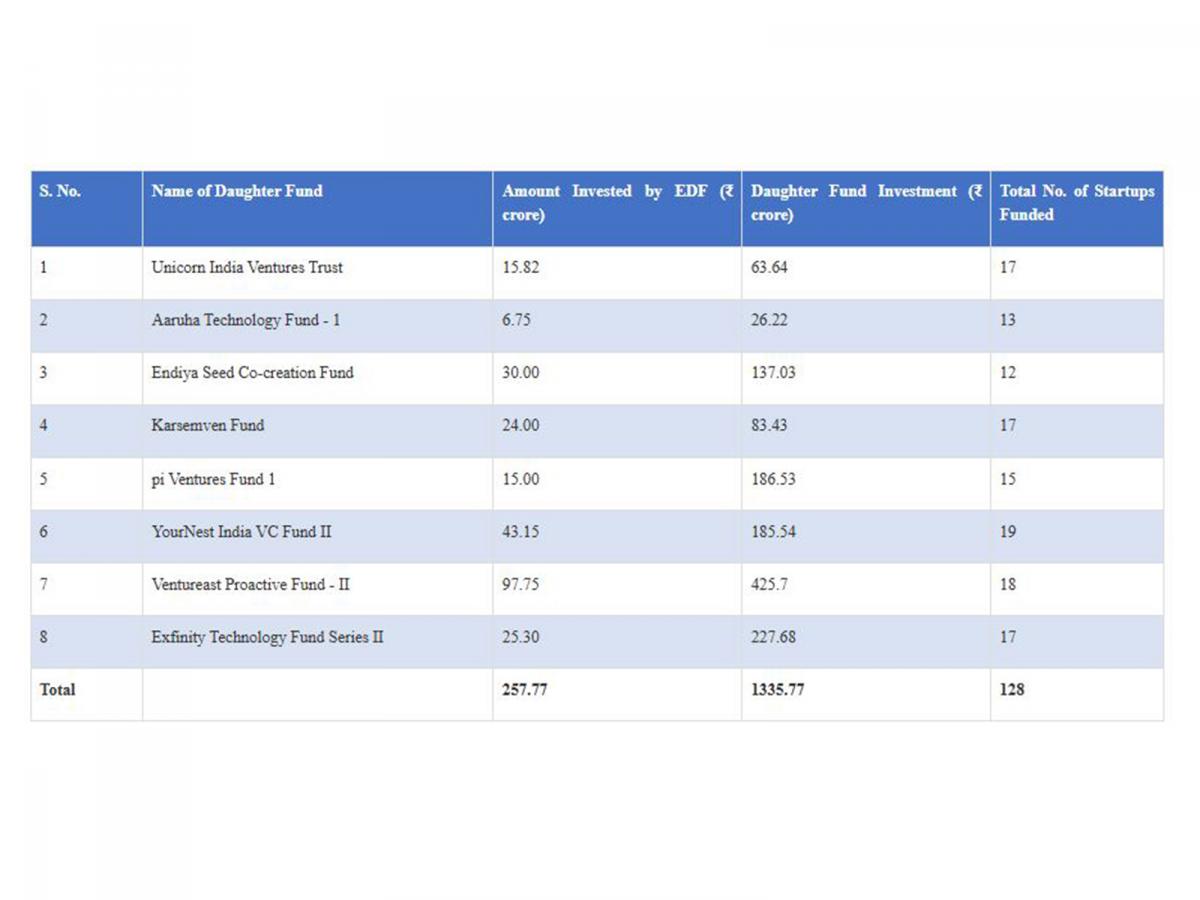 A total of 368 Intellectual Properties (IPs) have been created or acquired by the supported startups, it said. Out of the 128 supported startups, Daughter Funds have exited from 37 investments. The cumulative returns received by EDF from exits and partial exits stand at Rs 173.88 crore, the statement noted.