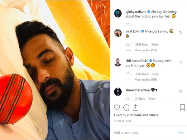 Team India vice-captain Ajinkya Rahane got trolled on social media by captain Virat Kohli and teammate Shikhar Dhawan after Jinks posted a picture about him dreaming about the historic day-night Test in Kolkata next to a pink ball. Ajinkya who enjoys a good social media following captioned the picture, Already dreaming about the historic pink ball, sensing the opportunity Virat and Shikhar immediately came up with a hilarious response. Nice pose jinksy, commented Virat while Dhawan wrote, "Sapne mein pic khich gayi.''