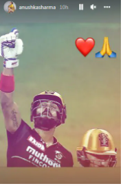 Royal Challengers Bangalore defeated Gujarat Titans by 8 wickets at the Wankhede Stadium to stay in the race for the IPL 2022 playoffs. Virat Kohli hit 73 runs off 54 balls and guided RCB to the victory. To note, RCB won their 8th match of the season and thereby keep their playoff hopes alive. Kohli was the chief architect of the game and Anushka Sharma shared an Instagram Story after hubby's Man of the Match award. Taking to her Instagram Stories post the match, Anushka shared a picture of Virat in which he is seen raising his bat in the air in celebratory mood. She added a heart emoticon and hands joined in prayer emoji.