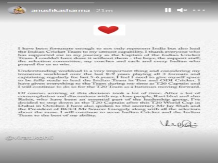 After Virat Kohli's decision to quit as India's T20 captain, his wife, Anushka Sharma, has come out in his support. The actress is all hearts for his decision. . She shared Virat's post on social media and added a heart emoji to it. The couple is currently in Dubai with their baby girl, Vamika. On September 16, Virat Kohli confirmed that he will step down as India's T20I captain after the T20 World Cup in the UAE in October-November. However, he said that he will continue to lead India in Tests and ODI cricket. "I have been fortunate enough to not only represent India but also lead the Indian cricket team to my utmost capability. I thank everyone who has supported me in my journey as the captain of the Indian cricket team. I couldn't have done without them - the boys, the support staff, the selection committee, my coaches and each and every Indian who played for us to win (sic)," Virat Kohli said in a statement on social media.