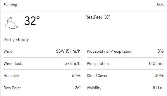 Accuweather.com predicts mostly cloudy skies for Sunday evening with 100% cloud cover and 66% humidity. However, there's a negligible chance of rain. The temperature is expected to be around 32 degrees Celsius (90 degrees Fahrenheit). Temperatures will dip slightly to 30 degrees Celsius (86 degrees Fahrenheit) at night, with persistent cloud cover but no rain forecast.