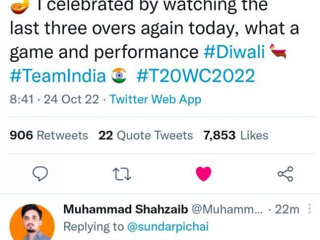 Virat Kohli produced an absolute masterclass in front of a packed MCG crowd against Pakistan to guide India to a famous win. Tributes poured in for Team India and Kohli from all across the country including Google CEO Sundar Pichai. He wrote on Twitter: “Happy Diwali! Hope everyone celebrating has a great time with your friends and family. I celebrated by watching the last three overs again today, what a game and performance #Diwali #TeamIndia #T20WC2022.”