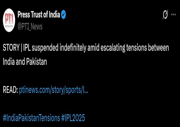 The Board of Control for Cricket in India (BCCI) has suspended the ongoing Indian Premier League (IPL) 2025 season indefinitely following escalating tensions between India and Pakistan. The decision, taken on Friday morning, comes in the wake of growing security concerns and rising unease among players, particularly after air raid alerts disrupted a league match in Dharamsala. According to a report in the Times of India, the majority of participating cricketers had expressed their discomfort in continuing the tournament under the current circumstances. The 58th match of the league — between Punjab Kings and Delhi Capitals — was halted midway on Thursday, after just 10.1 overs at the Himachal Pradesh Cricket Association (HPCA) Stadium, due to security alerts in neighboring cities such as Jammu and Pathankot.