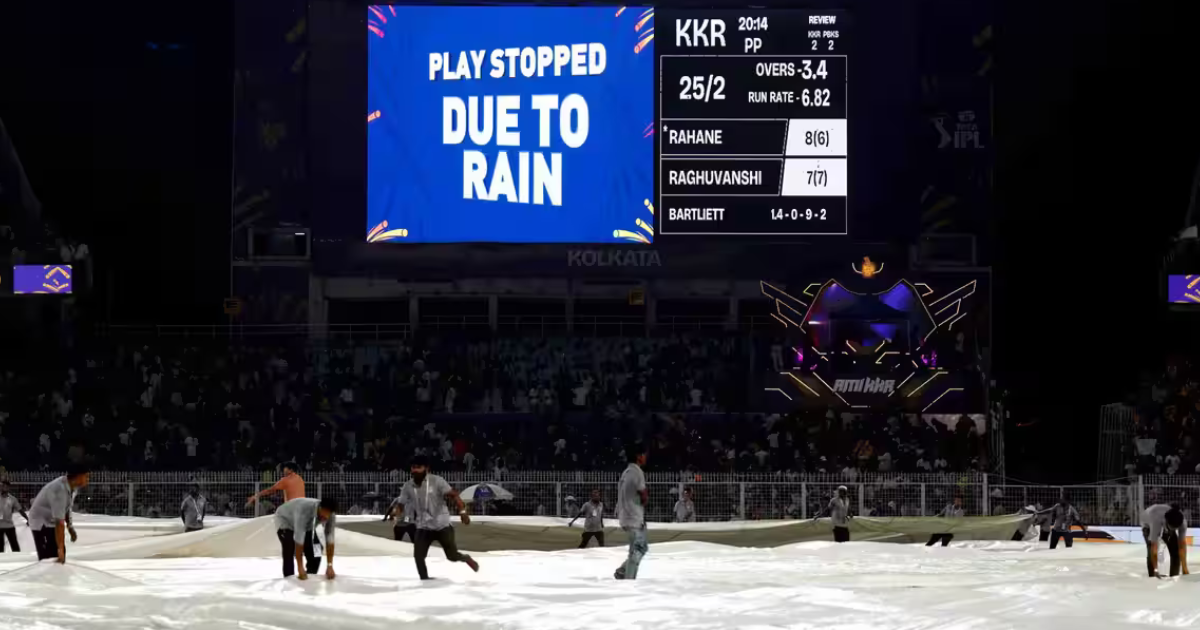 The match in Kolkata was halted early in the first innings with Kolkata struggling at 25 for 2 in 3.4 overs after opting to bat. Xavier Bartlett struck twice to dismiss Finn Allen and Cameron Green, leaving Ajinkya Rahane and Angkrish Raghuvanshi at the crease.