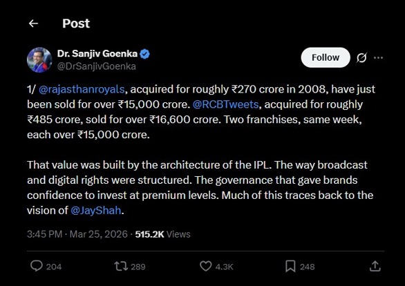 Lalit Modi, the founder of the Indian Premier League (IPL), has strongly criticised Sanjiv Goenka, owner of the Lucknow Super Giants, after Lucknow Super Giants owner credited former Board of Control for Cricket in India president Jay Shah for the league’s growth. Goenka, who praised Shah’s vision for building a strong foundation for the IPL. The dispute began after a social media post by Goenka referencing the record-breaking sale values of two franchises — Rajasthan Royals and Royal Challengers Bengaluru. A Kal Somani-led consortium reportedly acquired Rajasthan Royals for $1.63 billion, while Royal Challengers Bengaluru became the most expensive franchise in IPL history after being bought for $1.78 billion by a consortium that includes the Aditya Birla Group, Blackstone, Times of India Group and Bolt Ventures.