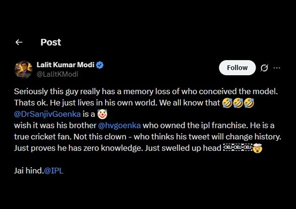 In his post, Goenka attributed the league’s growing valuation to its structural design, especially the media rights model, rather than to individuals. His remarks appeared to downplay Modi’s role in conceptualising the IPL. Reacting sharply on social media platform X, Modi accused Goenka of forgetting the origins of the league and called him a “clown”. In his post, Modi claimed Goenka had “memory loss” about who conceived the IPL model and asserted that history could not be rewritten through a tweet.