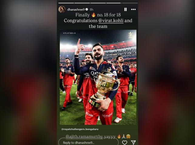 Royal Challengers Bengaluru won IPL 2025 trophy for the first time in 18 years. Everyone is applauding the team for their commendable performance. Punjab Kings fell short for 6 runs to lift the trophy. Dhanashree Verma who is ex-wife of Yuzvendra Chahal, who was a part of PBSk, congratulatedRCB for winning 18th edition of IPL 2025. She took Instagram and put story on Wednesday morning She shared a photo of Virat Kohli, RCB legend, taking a victory lap with the IPL 2025 trophy at the Narendra Modi stadium, captioning it: "Finally! No 18 for 18... Congratulations @virat.kohli and the team."4