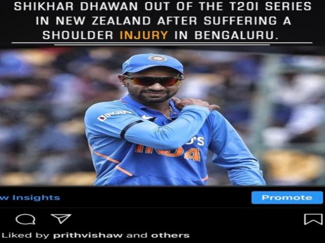 Young talent Prithvi Shaw who was in the news for his whirlwind century against New Zealand X1 in a tour game has once again managed to emerge in the spotlight. Shaw this happened to like an image of Dhawan being ruled out from the upcoming T20 series against New Zealand. In no time the Mumbai batsman become a trending hashtag on social media as Prithivi Shaw's name in the 'like' section went viral. Meanwhile, the selectors named Prithvi Shaw as Dhawan's replacement for the ODIs with Sanju Samson to replace the opener for T20s.