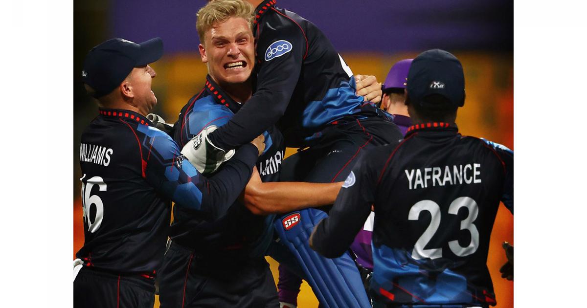 Zane Green and Ruben Trumpelmann managed to pick up nine runs from the 18th. In the 19th, Green sprinted for three twos in the over to take 12 runs and bring the equation down to 11 from the last six deliveries. Green dispatched the ball for a six on the first ball, and Trumpelmann walloped the low full toss for a four to seal a historic win for Nambia.