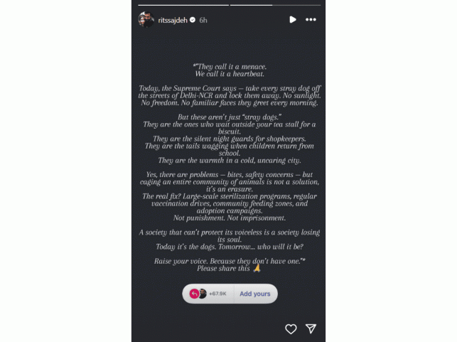 Ritika Sajdeh, wife of Indian cricketer Rohit Sharma, has voiced strong opposition to the Supreme Court’s recent order directing civic bodies across Delhi-NCR to capture all stray dogs and relocate them to shelters. In an Instagram story, Sajdeh described the court’s directive as a harsh measure. She wrote, “They call it a menace. We call it a heartbeat. Today, the Supreme Court says- take every stray dog off the streets of Delhi-NCR and lock them away. No sunlight. No freedom. No familiar faces greet every morning. But these are not just ‘stray dogs.’ They are the ones who wait outside your tea stall for a biscuit. They are the silent night guards for shopkeepers.”