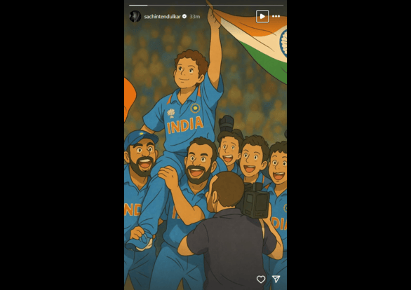 Cricket legend Sachin Tendulkar shared AI-generated illustrations on his Instagram story, reimagining iconic cricket moments in a Ghibli-style animation. One of the images shows Indian players carrying Tendulkar on their shoulders while holding the national flag. India’s victory on April 2, 2011 was one of the most memorable achievements in the country’s sporting history. Led by MS Dhoni the team defeated Sri Lanka and won India's second World Cup title after 28 years. Virat Kohli, who played a crucial role in the match, famously said, “He has carried the burden of the nation for 21 years. It was time we carried him.”