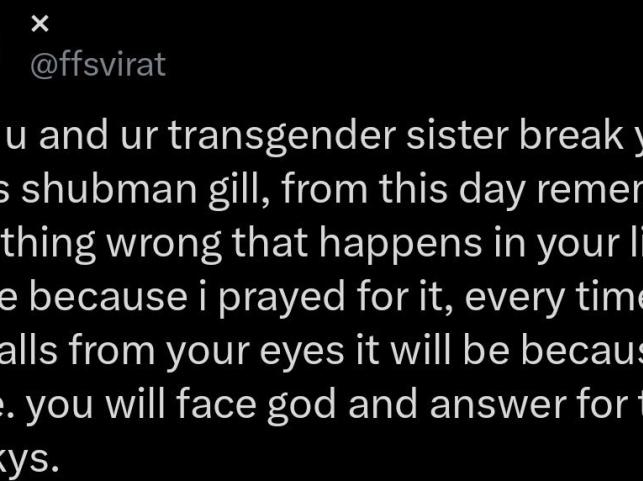 One Twitter user (@VamosVirat) posted a picture of a burnt car and wished that it was the vehicle driven by Shubman Gill. “With no one outside to put him into hospital,” he added. Another RCB fan wished physical harm on the young cricketer and labelled his sister Shahneel Gill as a ‘transgender’. “…From this day, remember, everything wrong that happens in your life will be because I prayed for it…” he cursed.The Virat Kohli ‘fan’ who earlier wished death on Shubman Gill, dubbed Shahneel as a ‘prostitute’ and called for her sale online for ₹9.This is not the first time that supporters of Virat Kohli have resorted to such behaviour. Earlier, they wished death upon Mumbai Indians (MI) captain Rohit Sharma and Chennai Super Kings (CSK) skipper MS Dhoni.