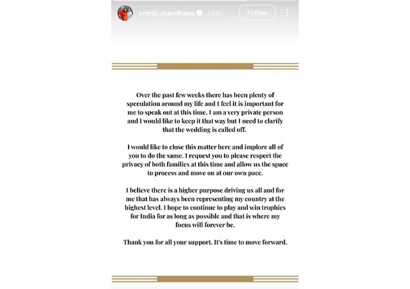 Amid weeks of intense speculation, star India women’s batter Smriti Mandhana has officially confirmed that her wedding with music composer Palash Muchhal has been called off. The announcement came on Sunday through an Instagram Story, where the cricketer addressed the rumours surrounding her personal life for the first time. Mandhana, who has consistently maintained a private stance on her personal affairs, urged everyone to allow both families the space to heal. “I would like to close this matter here and implore all of you to do the same,” she wrote. “I request you to please respect the privacy of both families at this time and allow us the space to process and move on at our own pace.”