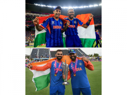 India national cricket team captain Suryakumar Yadav and all-rounder Hardik Pandya recreated an iconic Tricolour moment after the men in blue defeated the New Zealand national cricket team in the final of the ICC Men's T20 World Cup at the Narendra Modi Stadium in Ahmedabad on Sunday, March 8, 2026. India clinched its historic third T20 World Cup title with a 96-run victory. Following the final wicket of Jacob Duffy, the Indian players rushed onto the field to celebrate. Yadav and Pandya shared a special moment as they draped the Indian tricolour around their shoulders and posed for photographs.