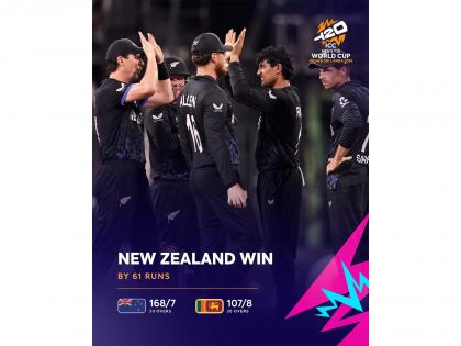 Colombo [Sri Lanka], February 25 : Fantastic all-round performances by Rachin Ravindra and skipper Mitchell Santner powered New Zealand to a 61-run win over Sri Lanka in their ICC T20 World Cup clash at Colombo on Wednesday, knocking out the co-hosts out of the competition.